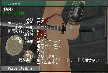 僕を見止めるとニヤニヤしながら手招きをして 「ふふふ、いい物を見せてあげましょう」 こ、これは・・・ なんというか・・・、凄いですね 「ふふふ、お宅の社長さんにだいぶお世話になったよ」 社長が一週間近く森に篭って伐採マシーンと化していたのはこの為だったのか・・・ しかし、食べ物は揚げパンだの焼肉だので済ませている人が多いのに こんなに大量のカレーが売り切れるものなんですかねぇ・・・ 「ふふふ、カレー作って、こうやって並べるだけで満足しちゃったから、売り切れなくてもいいかな こうやって露店枠がカレーで埋ってるのって、素敵やん?」 はぁ・・・、そうですか・・・ 売り切る意思もないのに大量生産して そのために社長をあそこまで酷使させるのですから やはりこの農場主殿は只者ではない そうそう、大量生産といえば 以前、ノアミサイルを十万発注文した方がやってきて 「ミサイルの追加頼むわ。ほんの2万発程度でいいから」 聞けばほんの三日ほどで5万発ほど消費したそうな そんなことよりも、彼の手元に輝く指輪が気になって仕方がない ジュエルマスターとしては見逃せない一品 「お、これか?ビスク中央にドゥーガンって細工師いるだろ?そいつの作品さ」 そして彼はQoAタイタン、6年後の未来の世界についてと 未来のドゥーガンに降りかかった出来事、それに関するクエストについて話してくれた へぇ~、そんな事が未来のドゥーガンさんに起きるんですか 一人の細工師と指輪にまつわる良い話を聞かせていただきました それにしても、貴方のその格好は一体なんなんです? 「あぁ、趣味DEATH」 そうDEATHか そうそう、指輪といえば・・・ 五万発